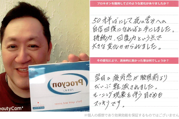 今まで他の活力サプリ試してダメだったのに、この指定医薬部外品は凄い!活力サプリに詳しい友達もスゴイと言ってただけあるなぁ。妻と年齢が離れていますがこれを愛用してるおかげで今でも現役です!